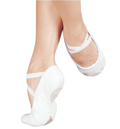 Sansha's "Pro" original canvas split-sole ballet slipper. The sole is fully hand stitched and thread does not appear on the outside of the shoe, so it will not wear out. This also means the sole is flush with the upper, so there is nothing to catch on the floor. Crisscross elastics attached at heel.